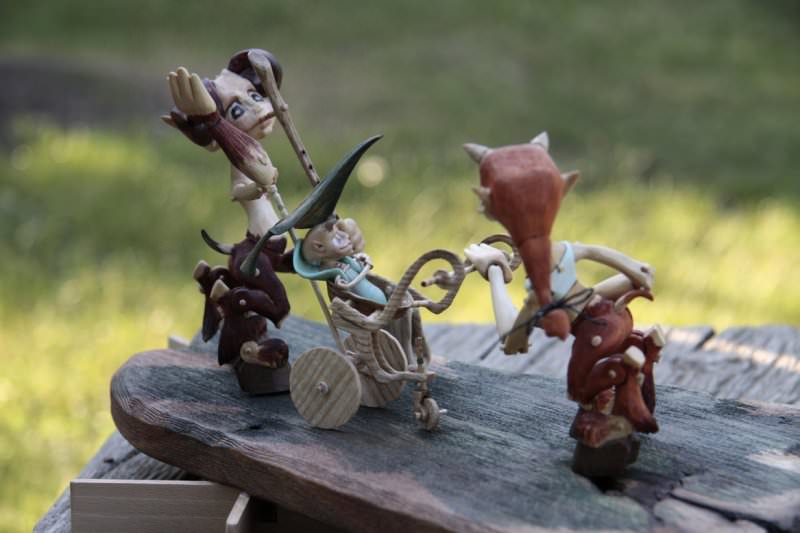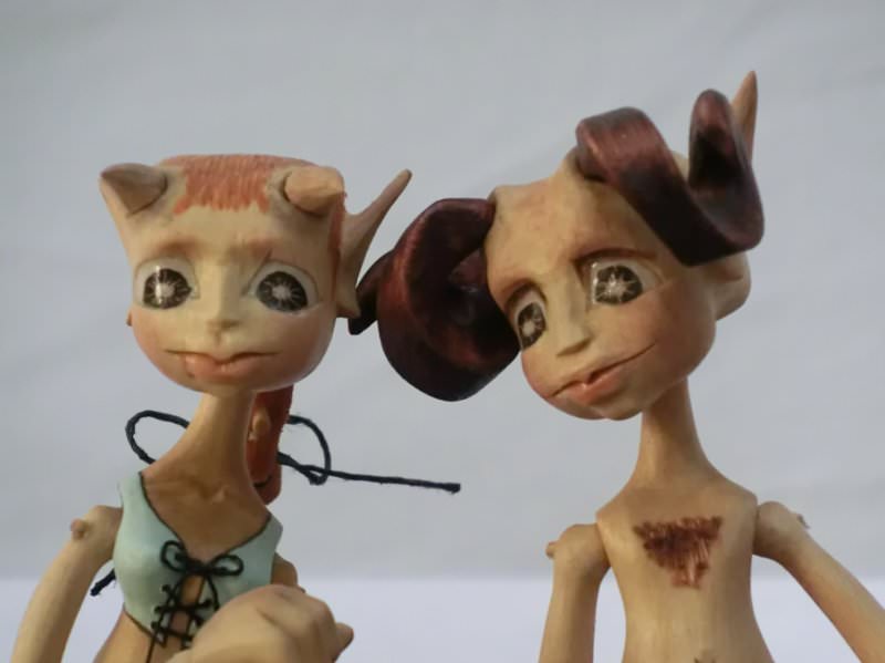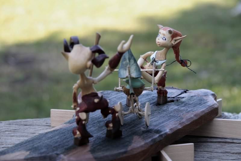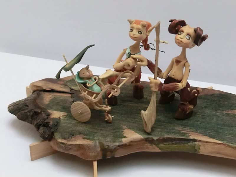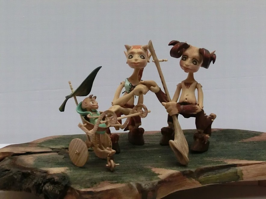 Tato rodinka Serafů je vyrobena technologií kolíčkových dolls. Nastavitelnost kloubních spojů zajišťuje těsnost klínových čepů a středové vedení kloubu vloženým čepem. Každá postavička má 15 kloubních spojů a kočárek jejich drobečka je ze skořápky ořechu a jasanového dřeva.