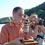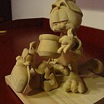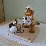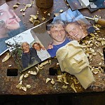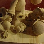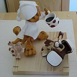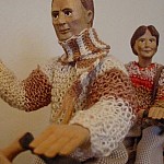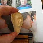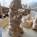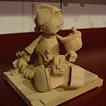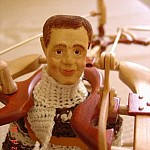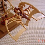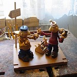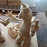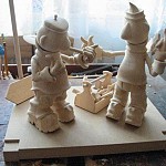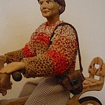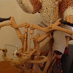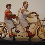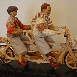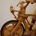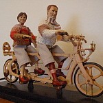 Zpracováno dle přání zákazníka a podle fotodokumentace postav. Při otáčení klikou se otáčí přední i zadní kolo a postavičky šlapou do pedálů tohoto dvoukola, opět je vše vyhotoveno pouze ve dřevě. Každá z postaviček má 7 nastavitelných kloubních spojů pro změnu gest.