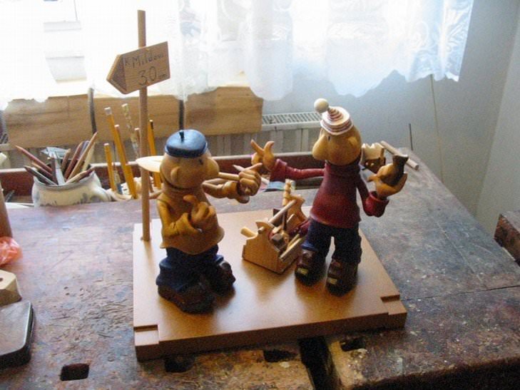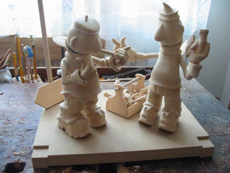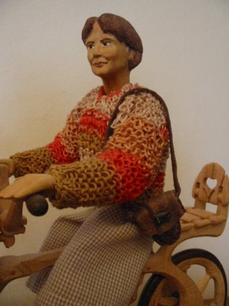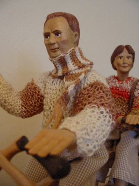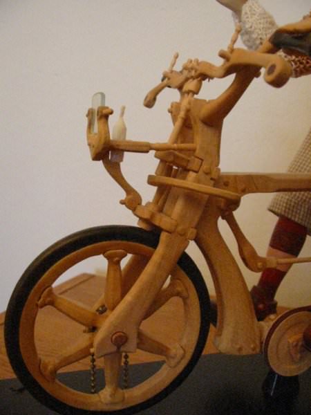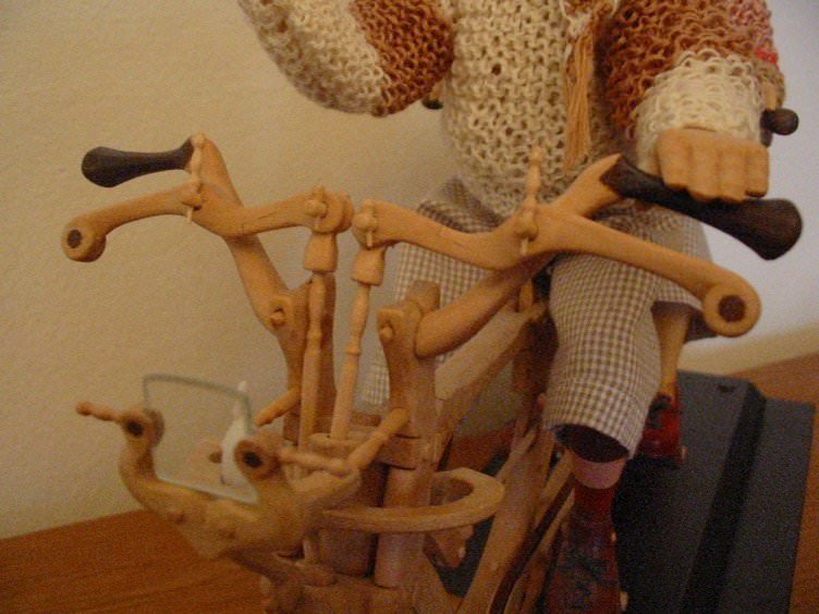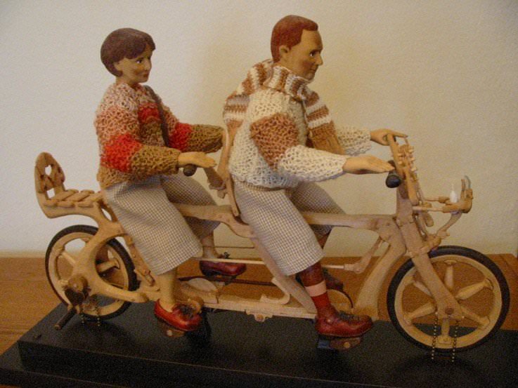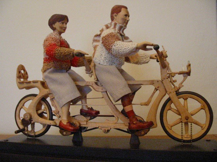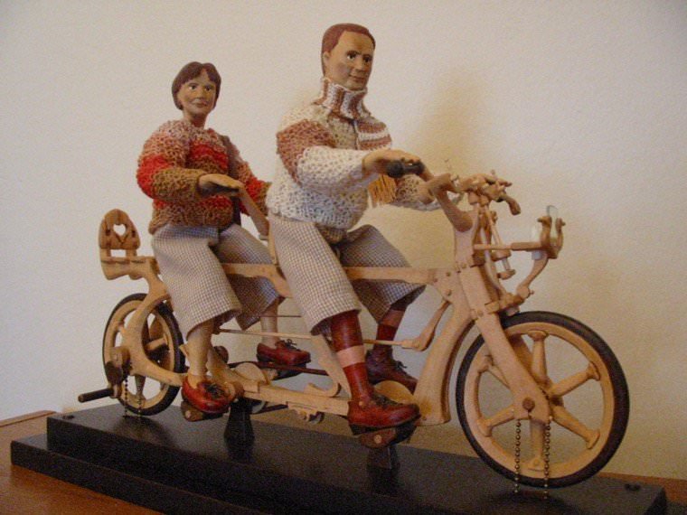 Zpracováno dle přání zákazníka a podle fotodokumentace postav. Při otáčení klikou se otáčí přední i zadní kolo a postavičky šlapou do pedálů tohoto dvoukola, opět je vše vyhotoveno pouze ve dřevě. Každá z postaviček má 7 nastavitelných kloubních spojů pro změnu gest.