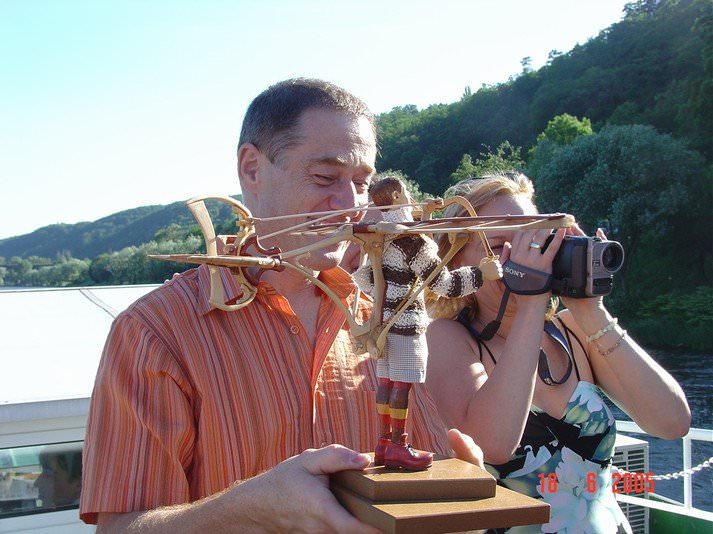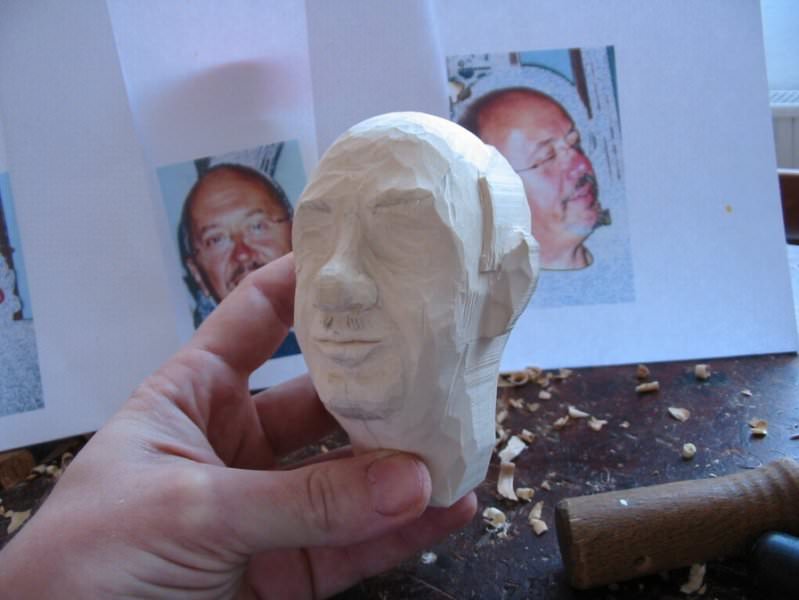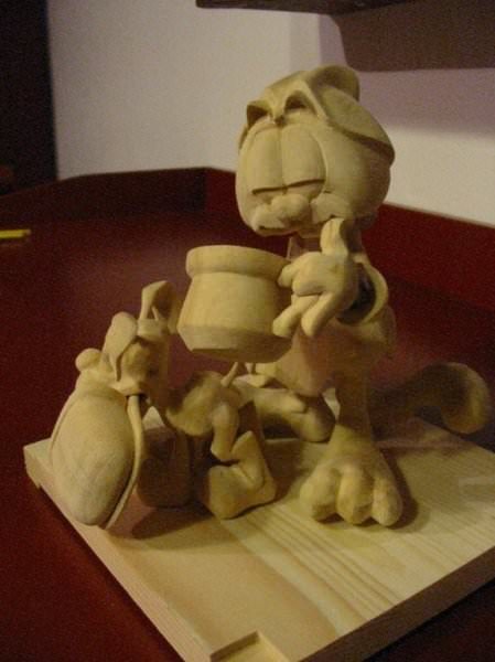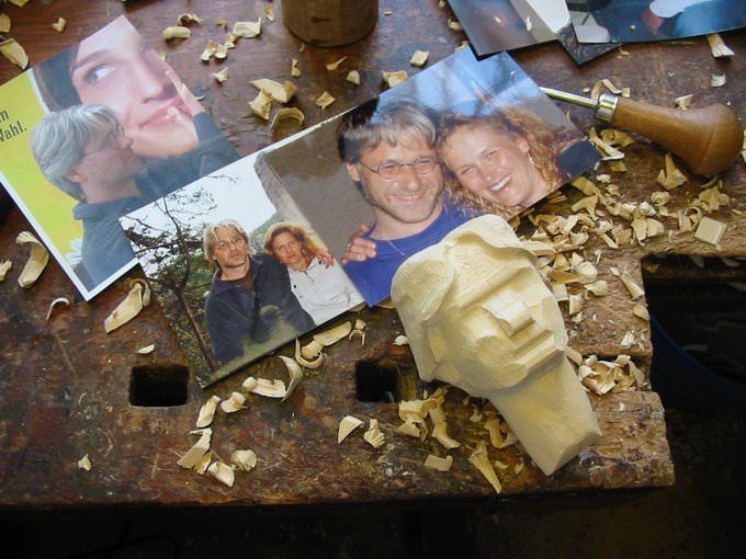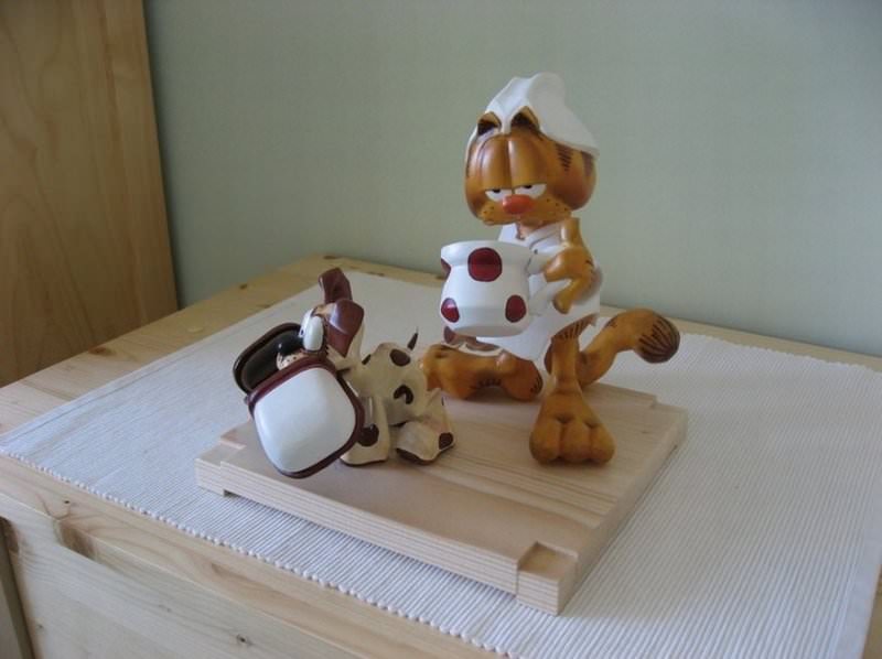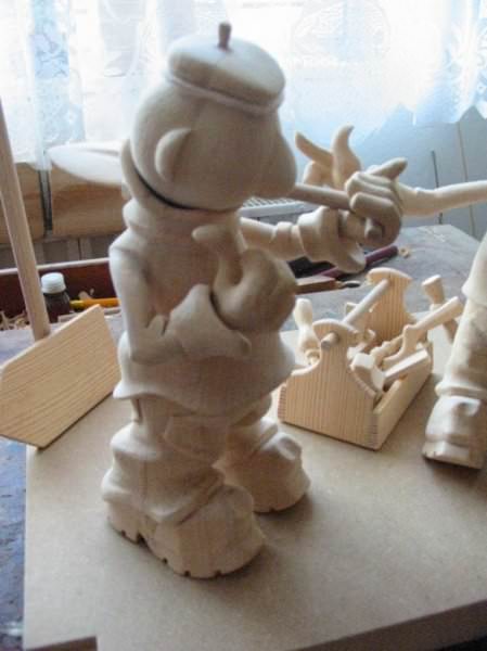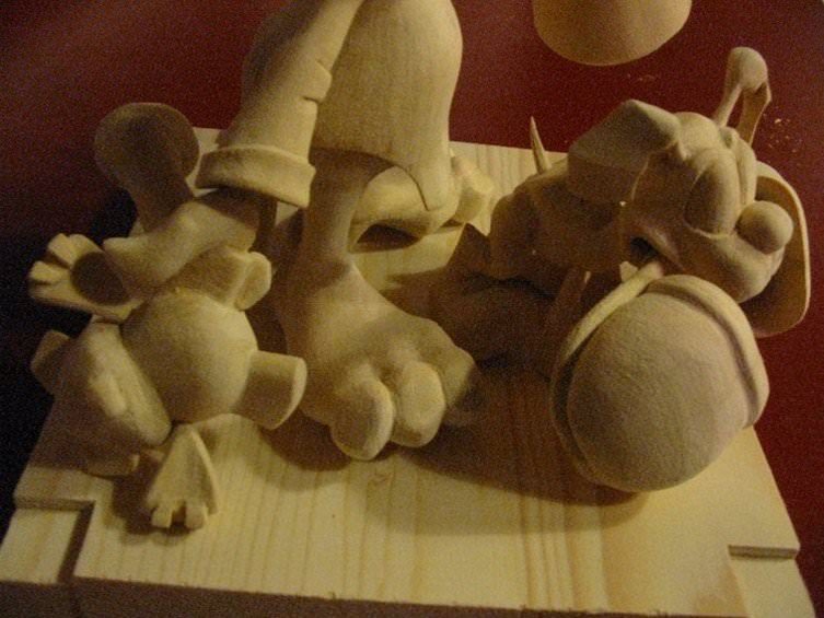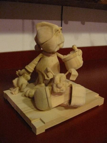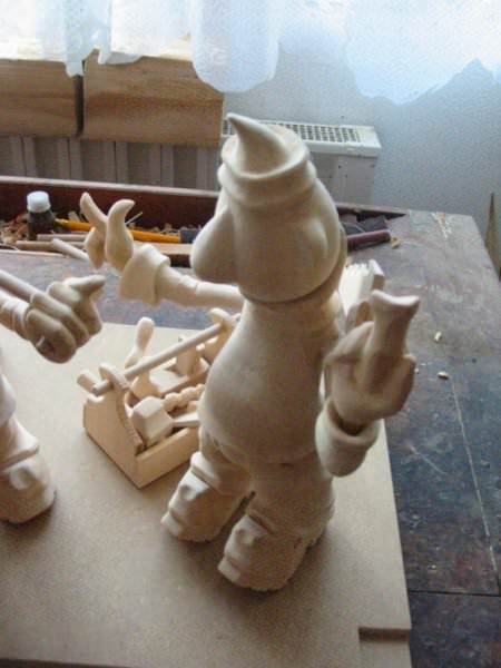 Zpracováno dle přání zákazníka a podle fotodokumentace postav. Při otáčení klikou se otáčí přední i zadní kolo a postavičky šlapou do pedálů tohoto dvoukola, opět je vše vyhotoveno pouze ve dřevě. Každá z postaviček má 7 nastavitelných kloubních spojů pro změnu gest.